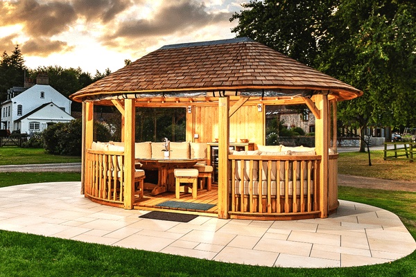 Les gazebos ouverts de Crown Pavilions partagent tous une ossature en bois massif pour durer longtemps. Que ce soient des gazebos ronds ou des gazebos rectangulaires, ces derniers sont soutenus par de solides rambardes en bois rouge. Vous pouvez également demander un pack premium pour un gazebo avec plus de rambardes, selon vos préférences. Vous pouvez y accéder facilement par une ou plusieurs entrées, selon le modèle. Ces magnifiques joyaux d'extérieur sont généralement construits avec de grands toits en tuiles de cèdre, une sous-toiture en contreplaqué marin dans le pack classique, et en bois massif dans le pack premium. Les toits sont suffisamment hauts pour permettre une circulation continue de l'air, assurant ainsi un climat intérieur agréable et sain. L'abondante fenestration est la touche magique des gazebos Crown. Elle laisse entrer beaucoup de lumière par une journée ensoleillée, ce qui vous permet de profiter d'un maximum de lumière naturelle et d'une atmosphère détendue.